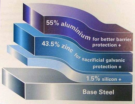 - Lớp mạ thứ 2 là 55% nhôm có nhiệm vụ chống oxi hóa từ môi trường bên ngoài đồng thời bảo vệ lớp mạ thứ nhất và nền thép bên trong.